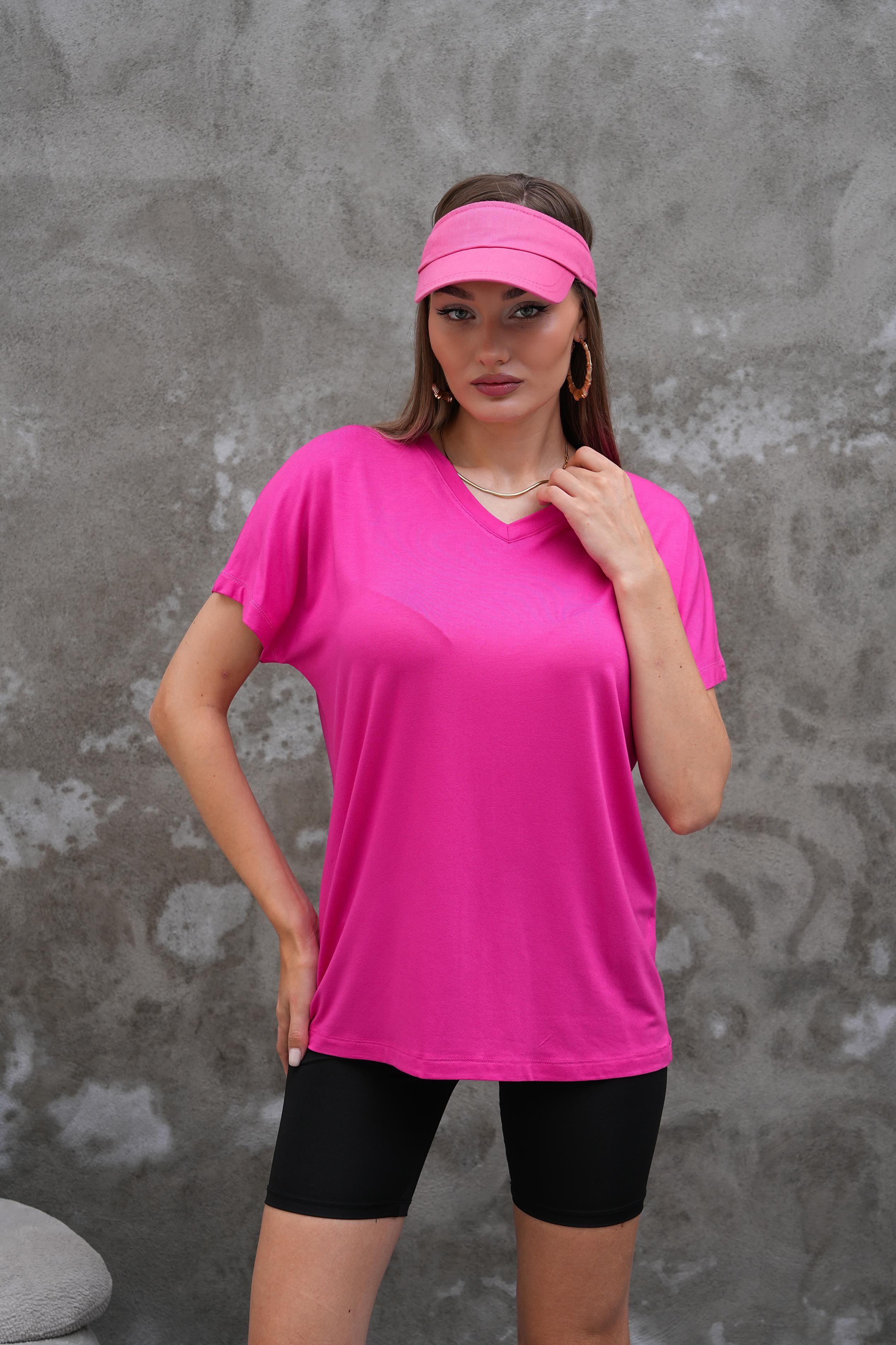 V Yaka Bambu Viskon T-Şhirt-Fuşya Pembe