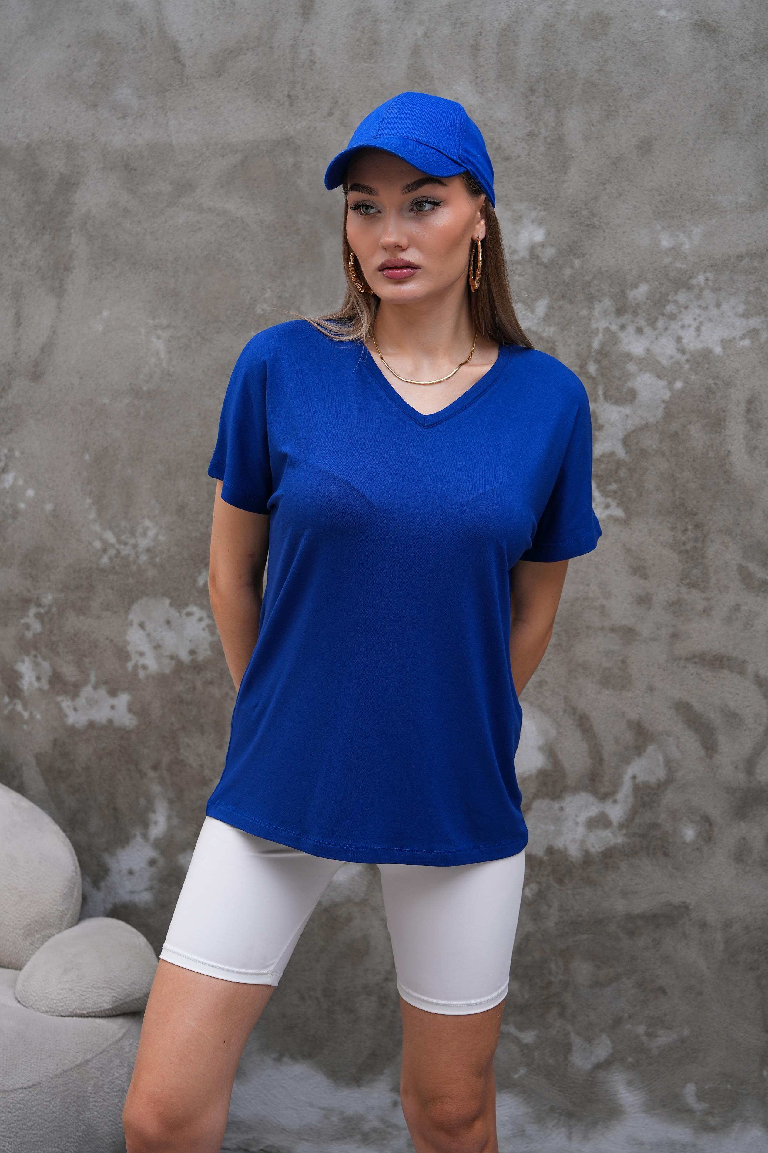 V Yaka Bambu Viskon T-Şhirt-Saks Mavi