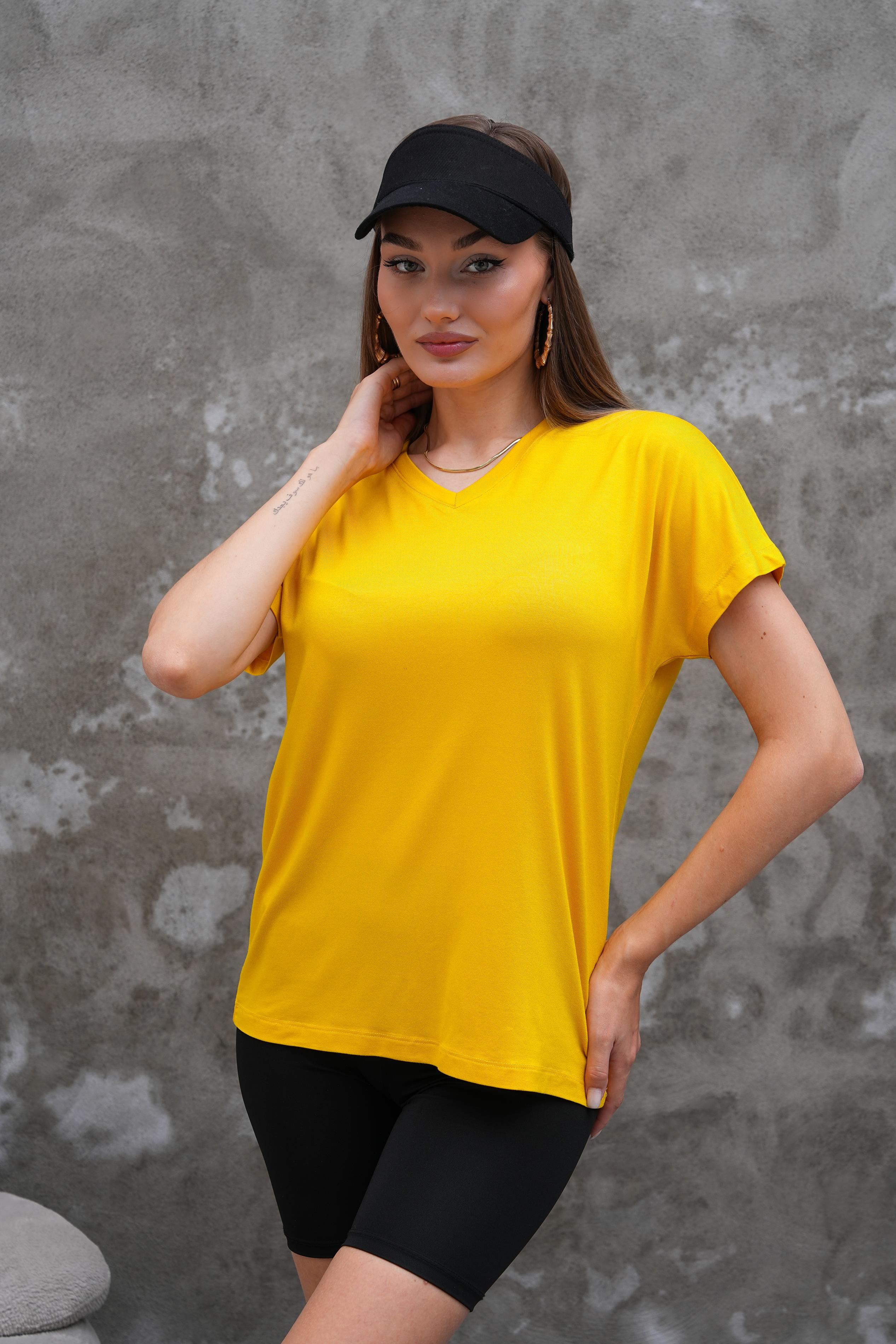V Yaka Bambu Viskon T-Şhirt-Sarı