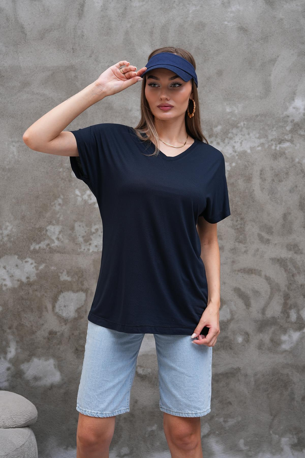 V Yaka Bambu Viskon T-Şhirt-Koyu Lacivert