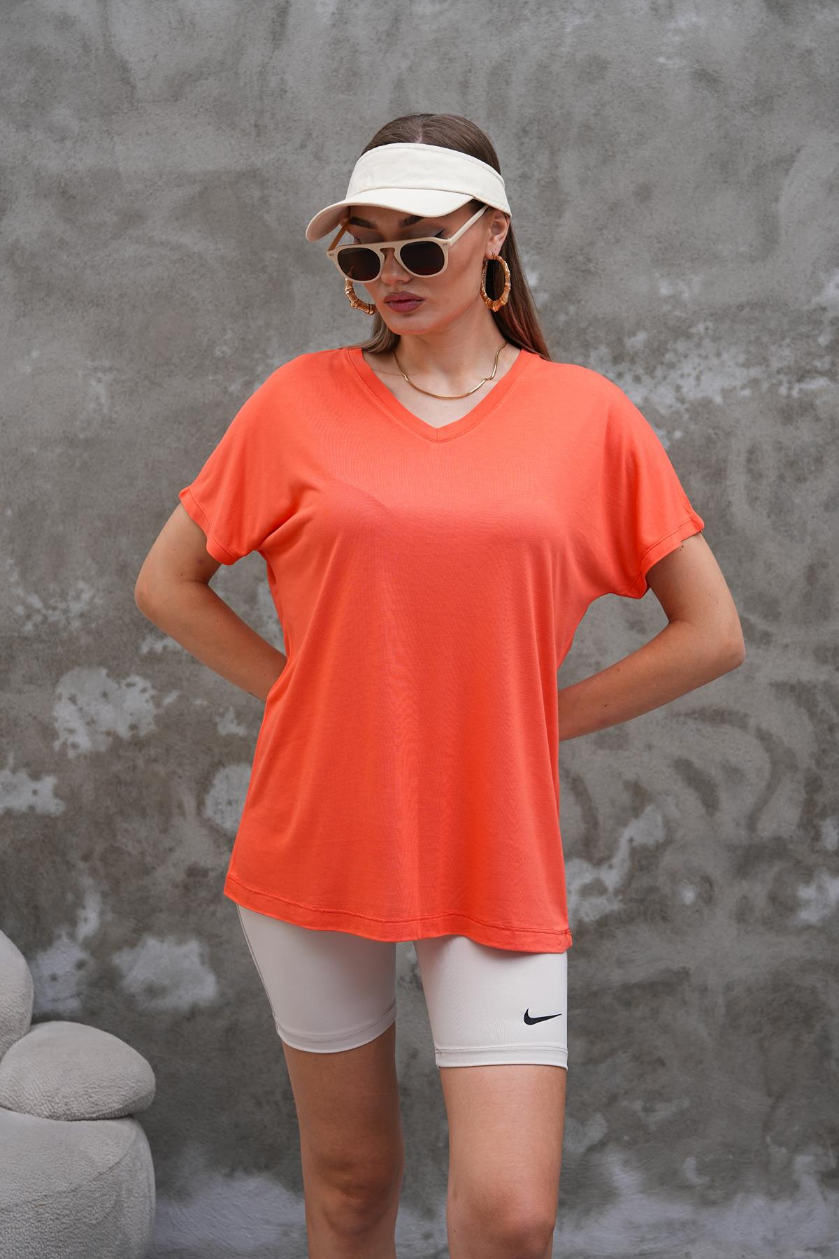 V Yaka Bambu Viskon T-Şhirt-Açık Turuncu