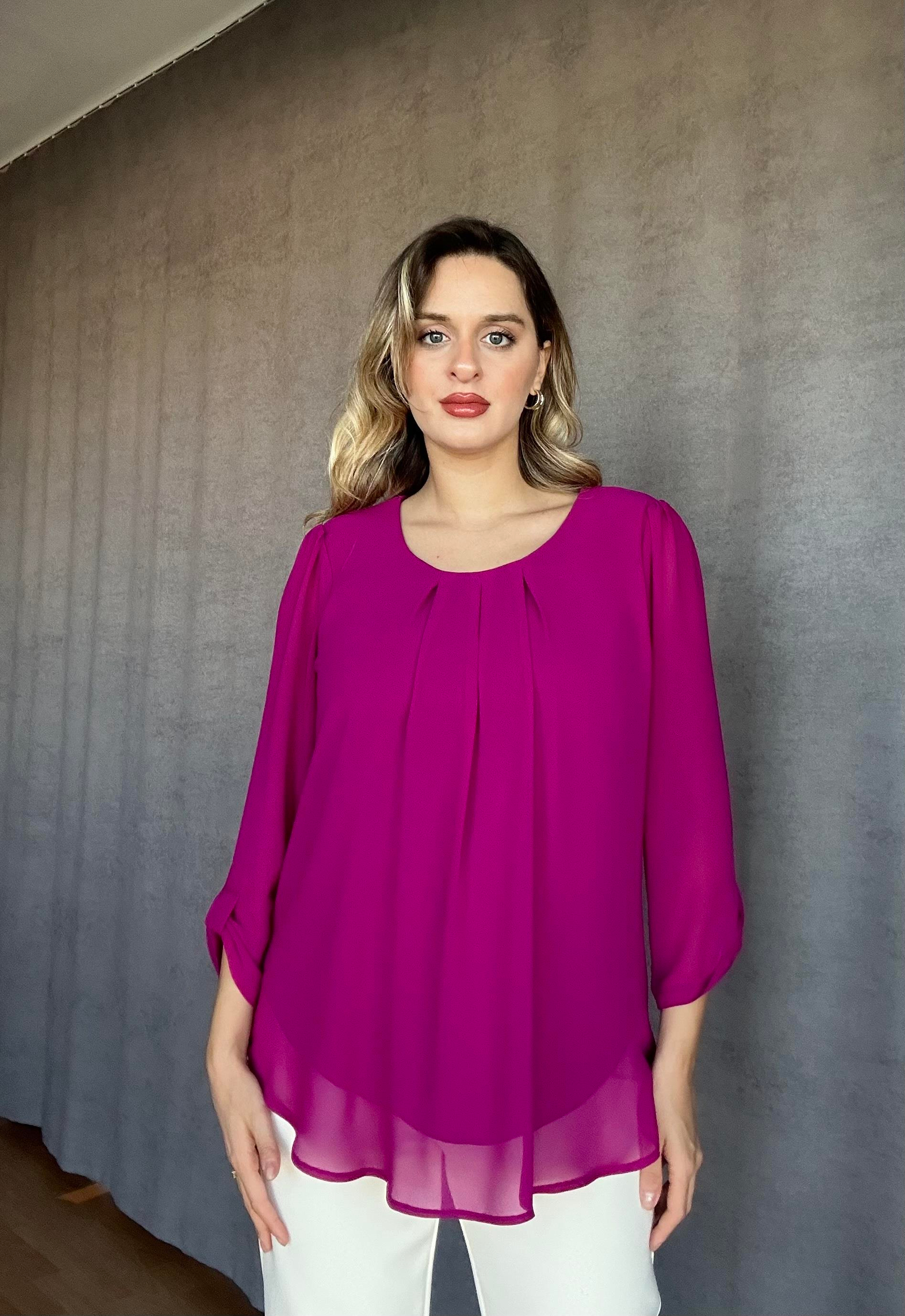 Yaka Pileli Şifon Bluz Fuşya-Norveç